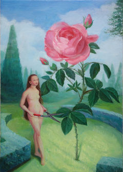 le travail de hualing xu est parsemé de roses, mais aussi d’hortensias, sa fleur « pink » préférée, une couleur qu’elle définit comme « brève et mystérieuse ». pour pink by quand les fleurs nous sauvent, hualing xu peint une toile intitulée "la désirée". cette eve, réalisée dans le canon du peintre lucas cranach, une des références importantes dans son travail, s’apprête, à l’aide d’une cisaille, à couper une immense rose.son autre toile, "alma mater", est une référence directe à la période où l'artiste a allaité. hualing xu dépeint à merveille le pouvoir charnel, nourricier et réconfortant des fleurs à travers cette femme-fleurs, image de la terre-mère. son univers, habité par une nature toujours plus imposante que ses personnages, est aussi étrange que solaire car, comme le résume hualing xu : « je cherche quelque chose derrière la beauté ».